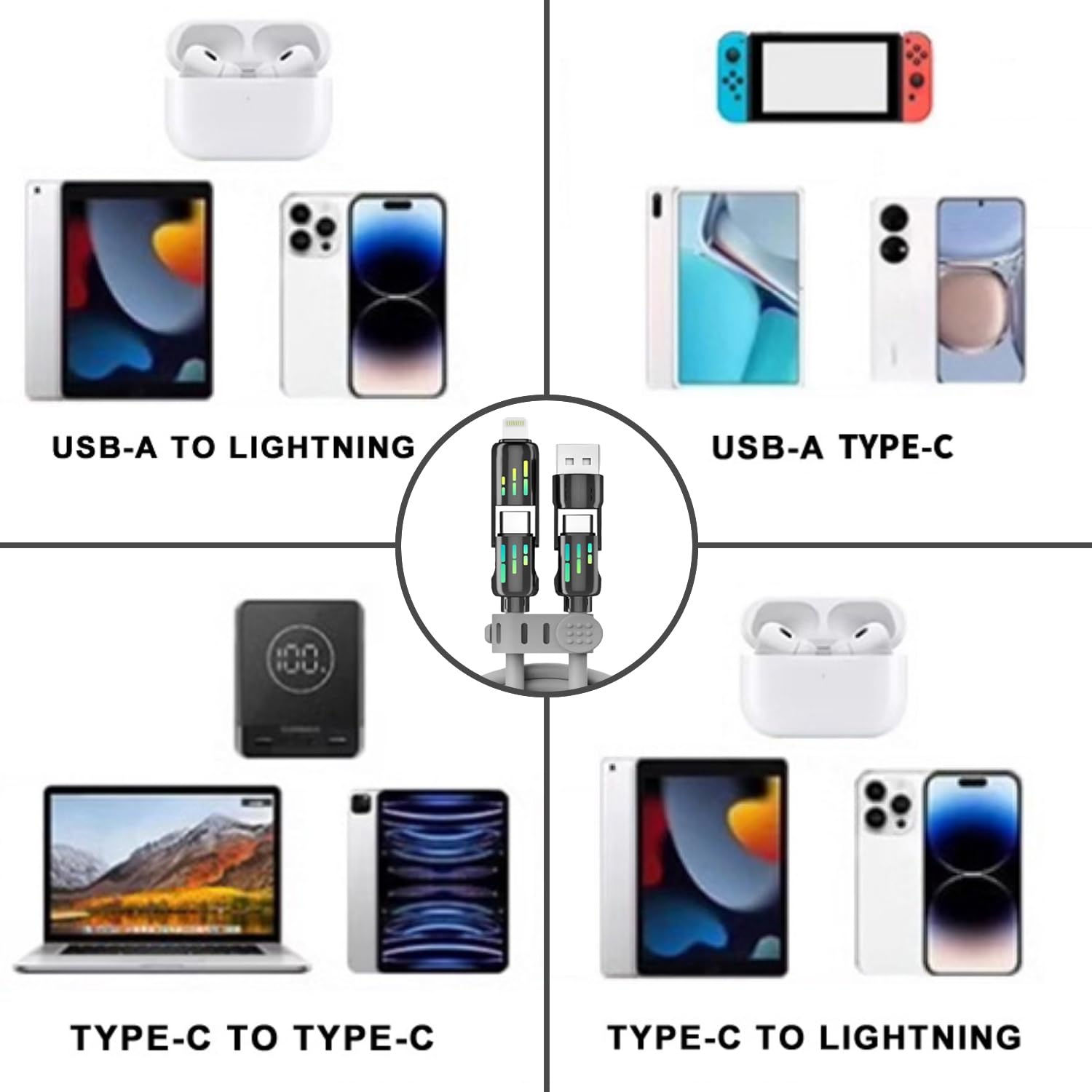 S tem 4-v-1 kablom imaš vse, kar potrebuješ za hitro polnjenje in prenos podatkov. Združuje 4 različne priključke v enem kablu, kar pomeni, da lahko enostavno polniš vse svoje naprave. Združljiv je z napravami iPhone, Android in z vsemi napravami s priključkom C.
