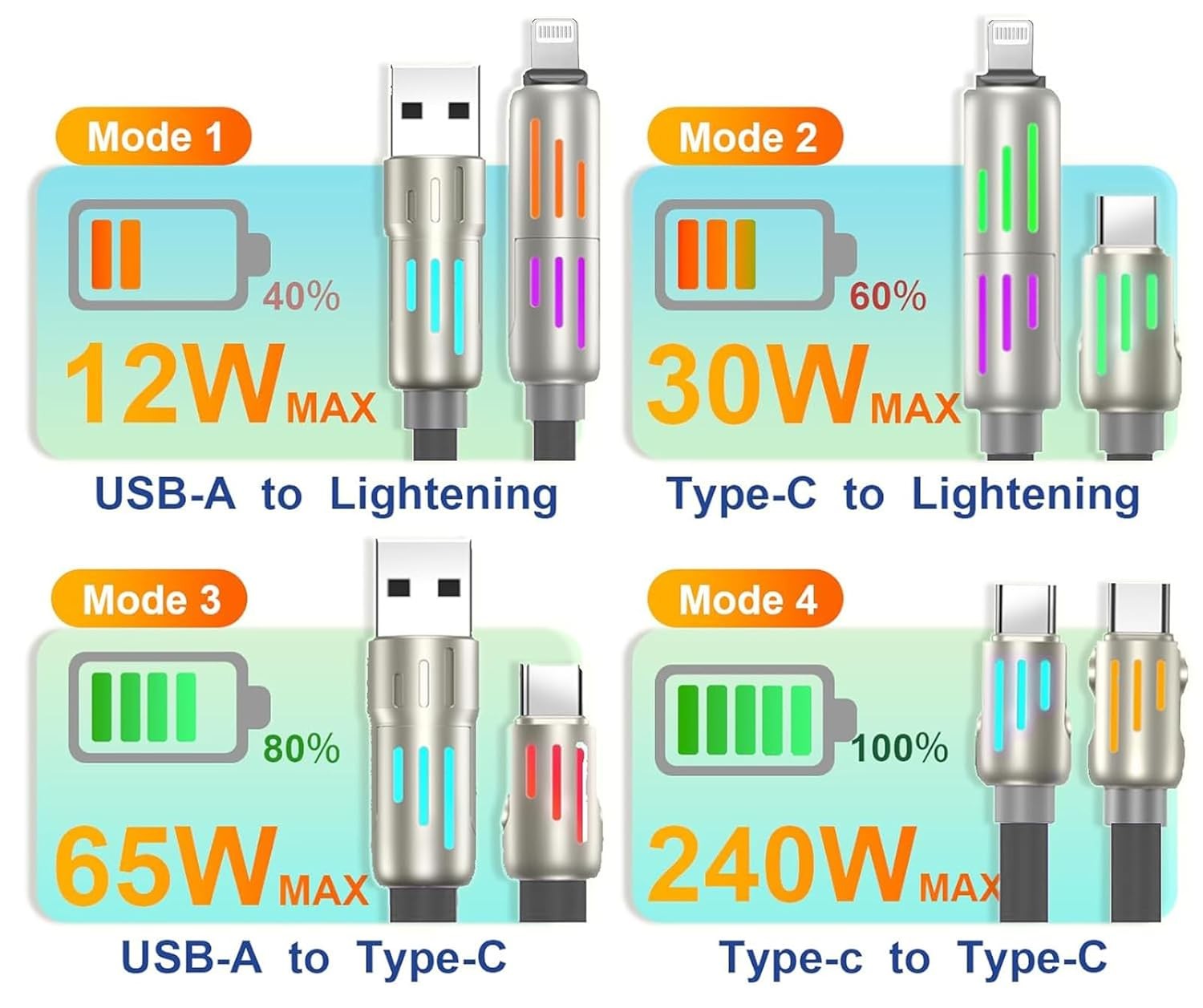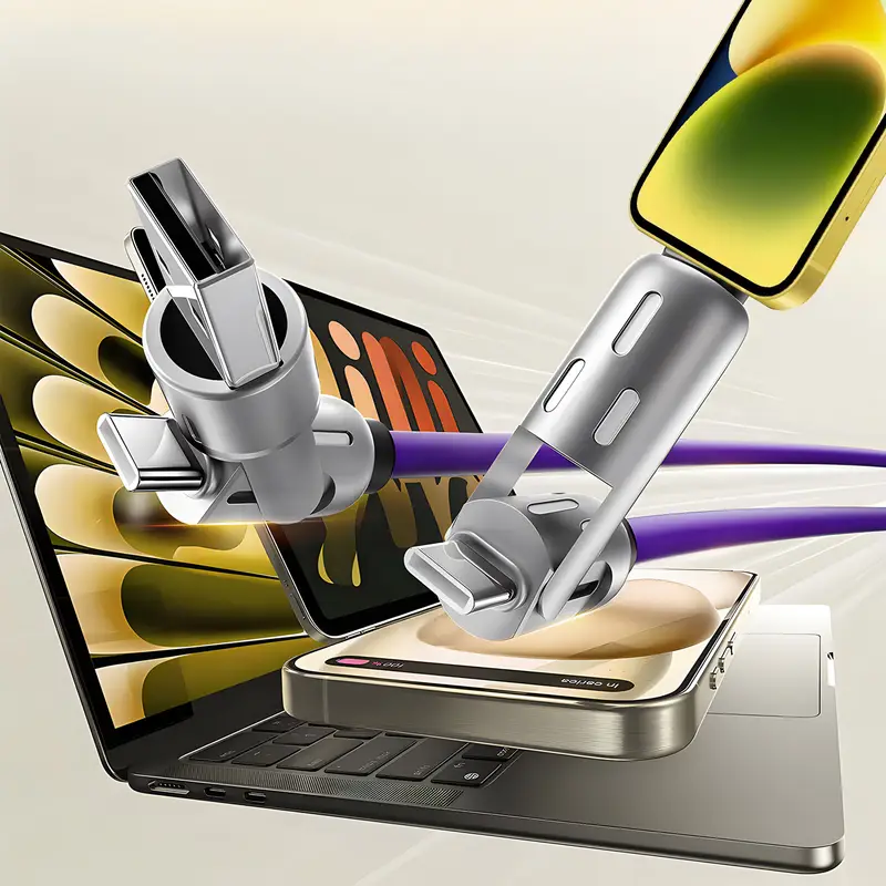 4-v-1 hitri podatkovni kabel ZINC omogoča hitro polnjenje do 240W in prenos podatkov do 480 Mbps. Združuje štiri različne priključke v enem kablu, kar zagotavlja enostavno polnjenje in upravljanje naprav.