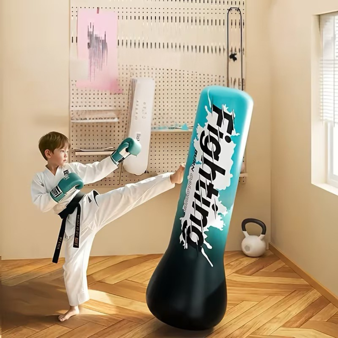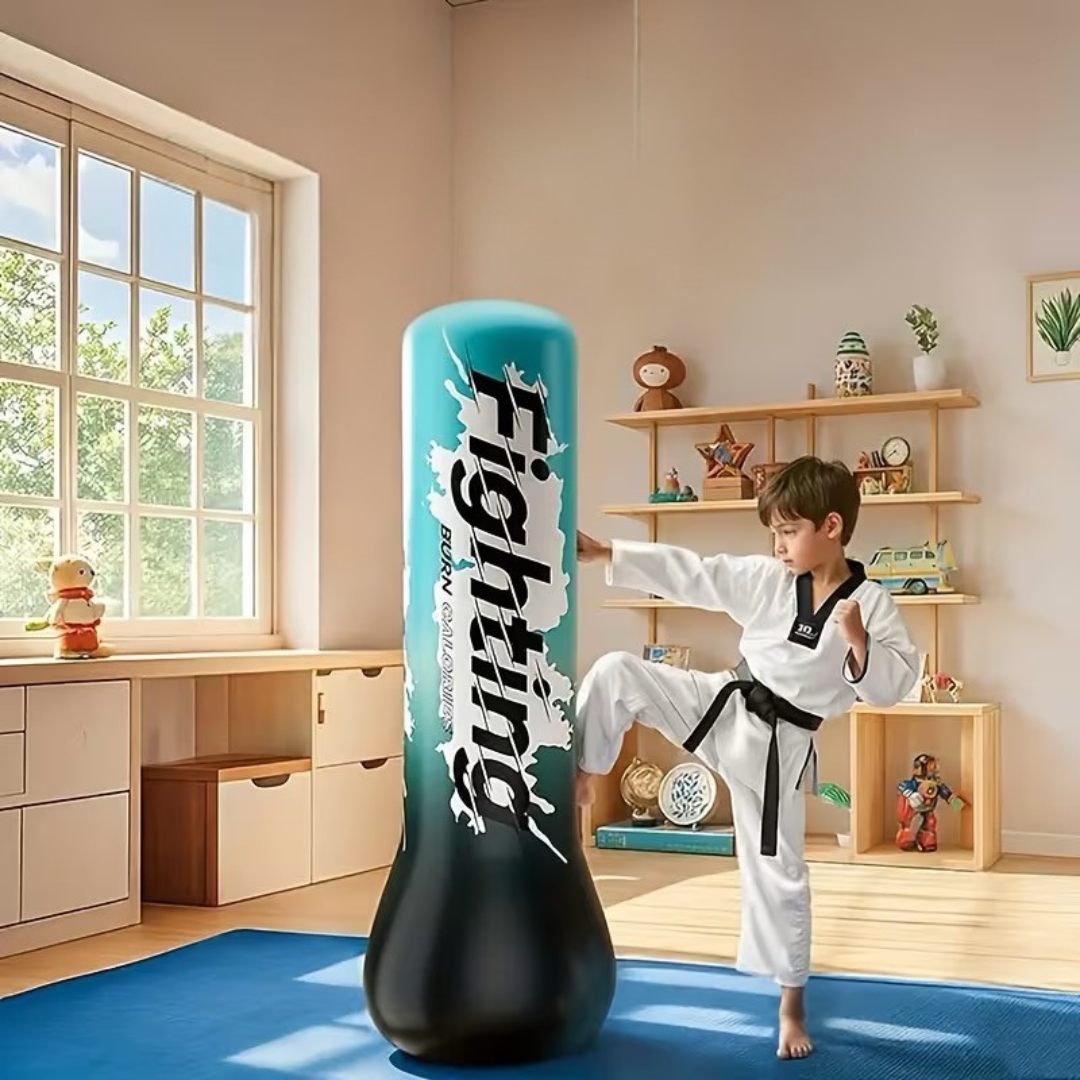 Zahvaljujoč čvrsti bazi boksarska vreča ostane stabilna na tleh, preprogah, ploščicah, balkonih ali zunanjih površinah, kar otrokom omogoča samozavesten trening brez drsenja ali prevračanja.