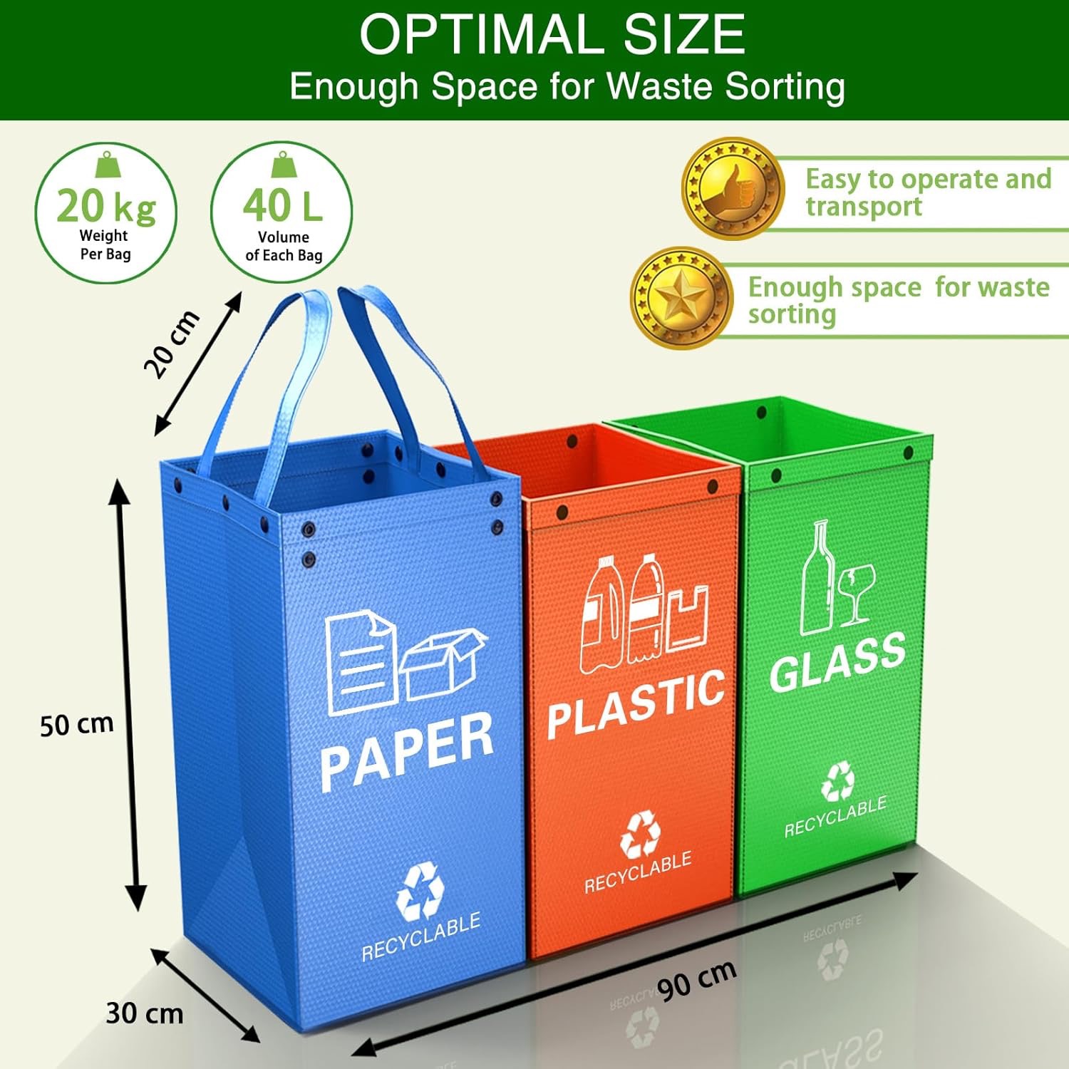 Vsaka vreča ima ojačane šive in podaljšane ročaje za dodatno vzdržljivost in udobje pri nošenju. Namenjene so prenašanju tudi težjih reciklabilnih materialov, zato lahko odpadke preprosto in brez skrbi prenašate.