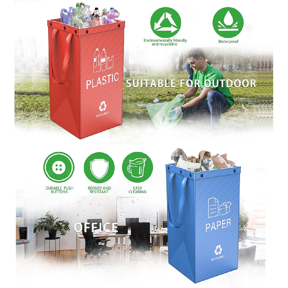 Vreče so zasnovane za dolgo življenjsko dobo in enostavno vzdrževanje. Njihova vodoodporna površina omogoča, da jih preprosto obrišete ali sperete z vodo za svežo in higiensko rešitev za recikliranje. Svetle in moderne barve jih naredijo privlačen dodatek v vašem domu.