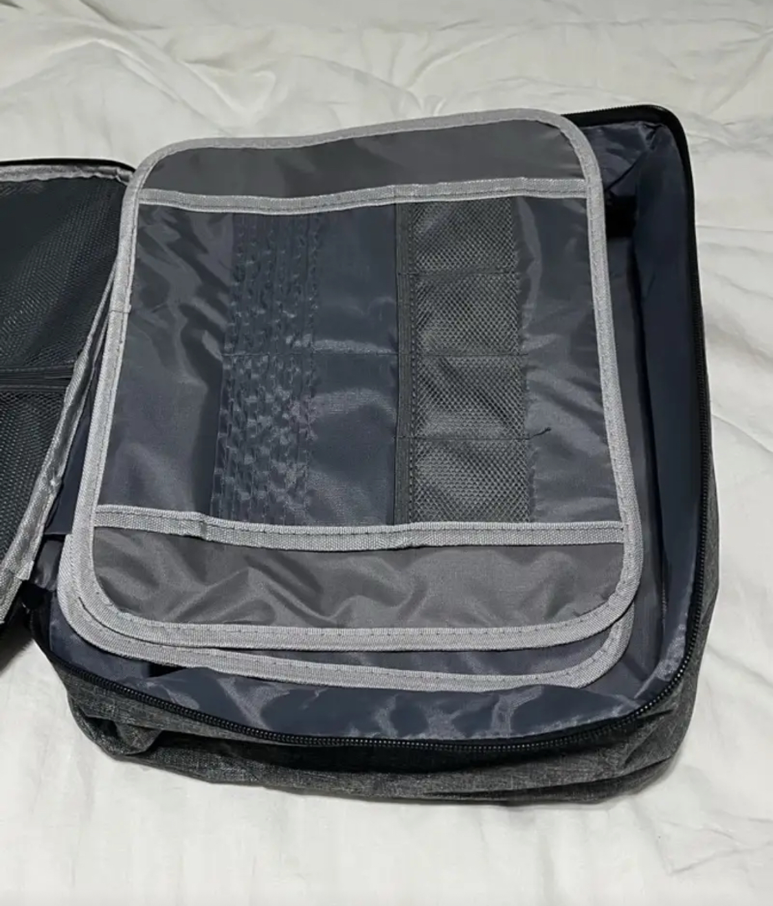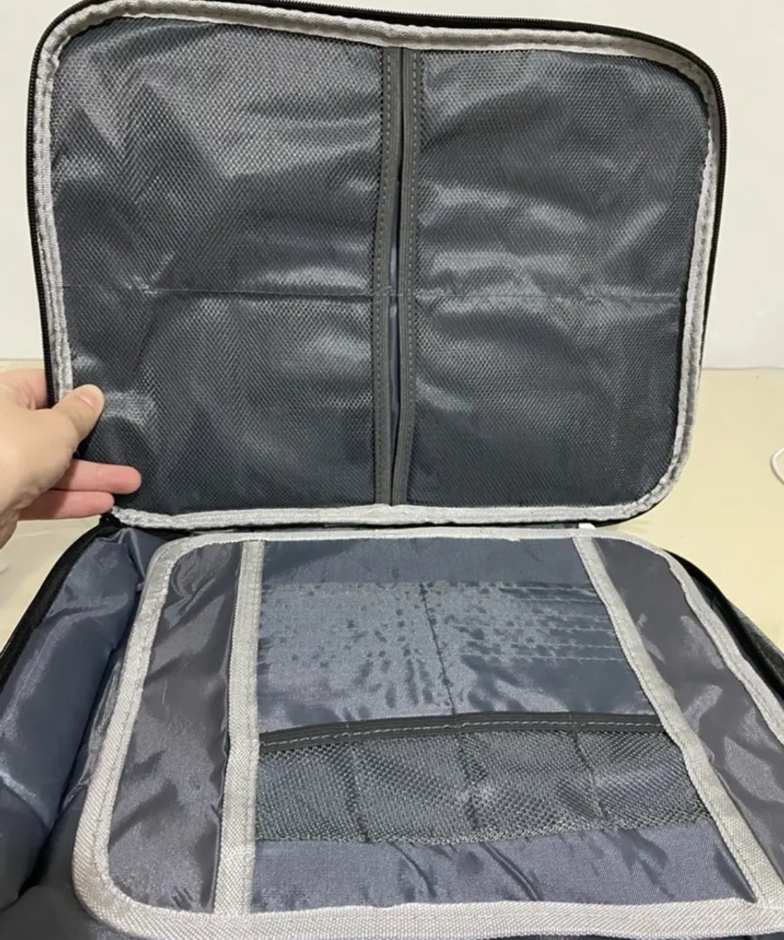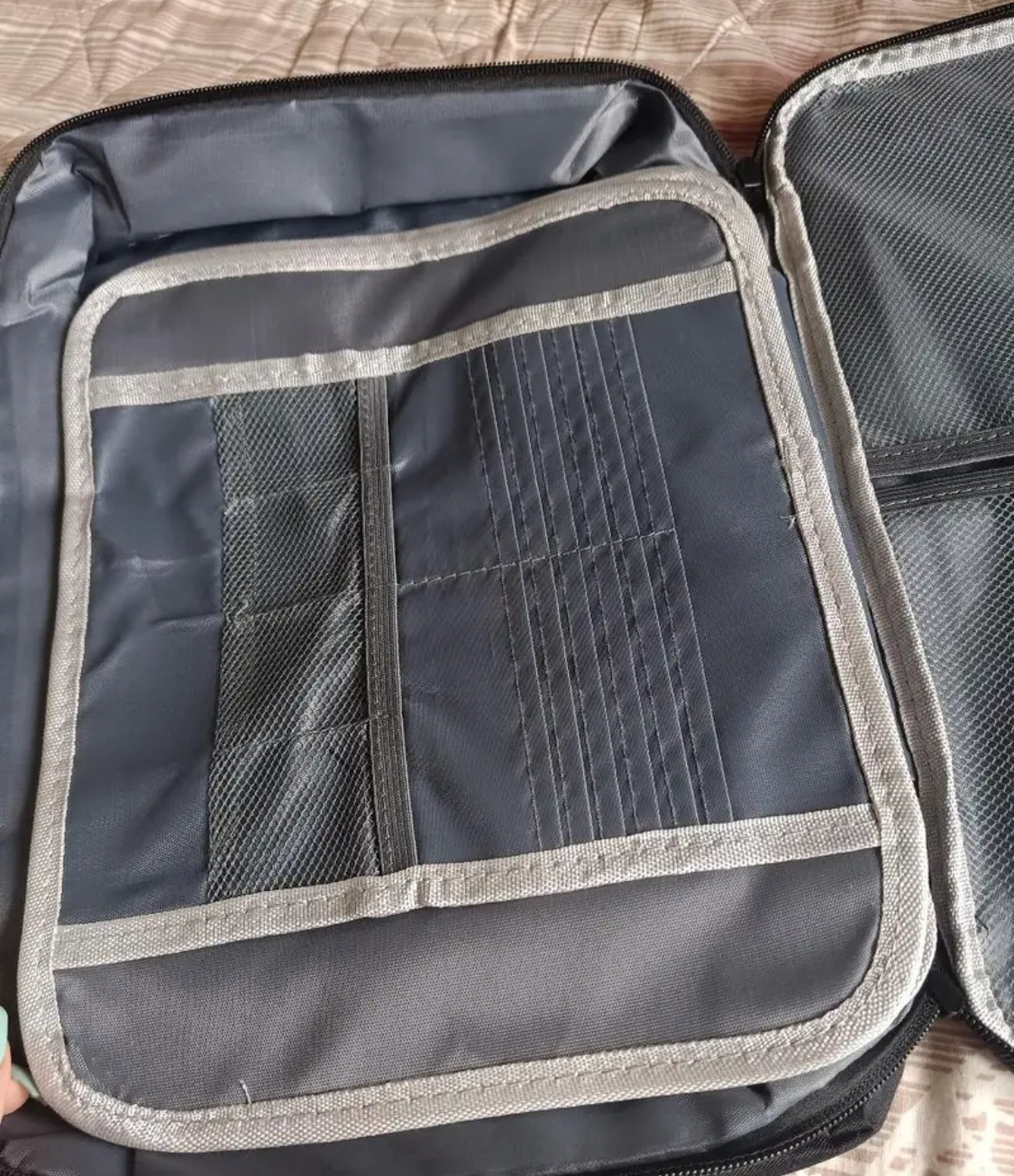 Torbica ima večslojne predalčke, vgrajene pregrade in razširljive razdelke, ki olajšajo shranjevanje dokumentov različnih dimenzij. Prozorni mrežasti predalčki omogočajo hitro preglednost, tako da brez težav najdete pravi dokument.