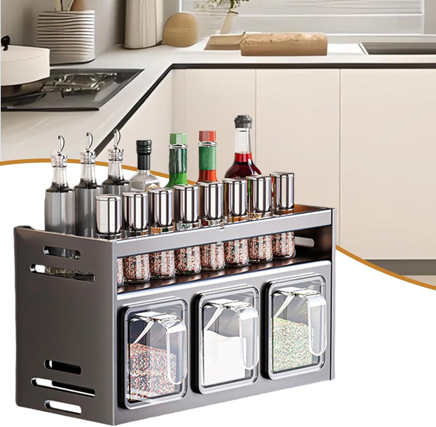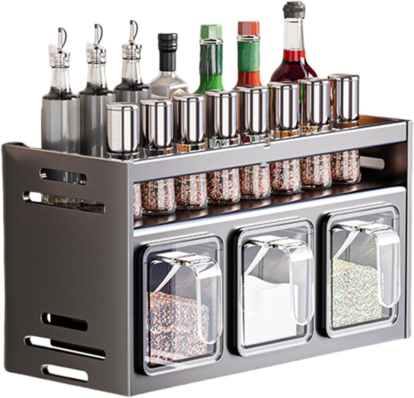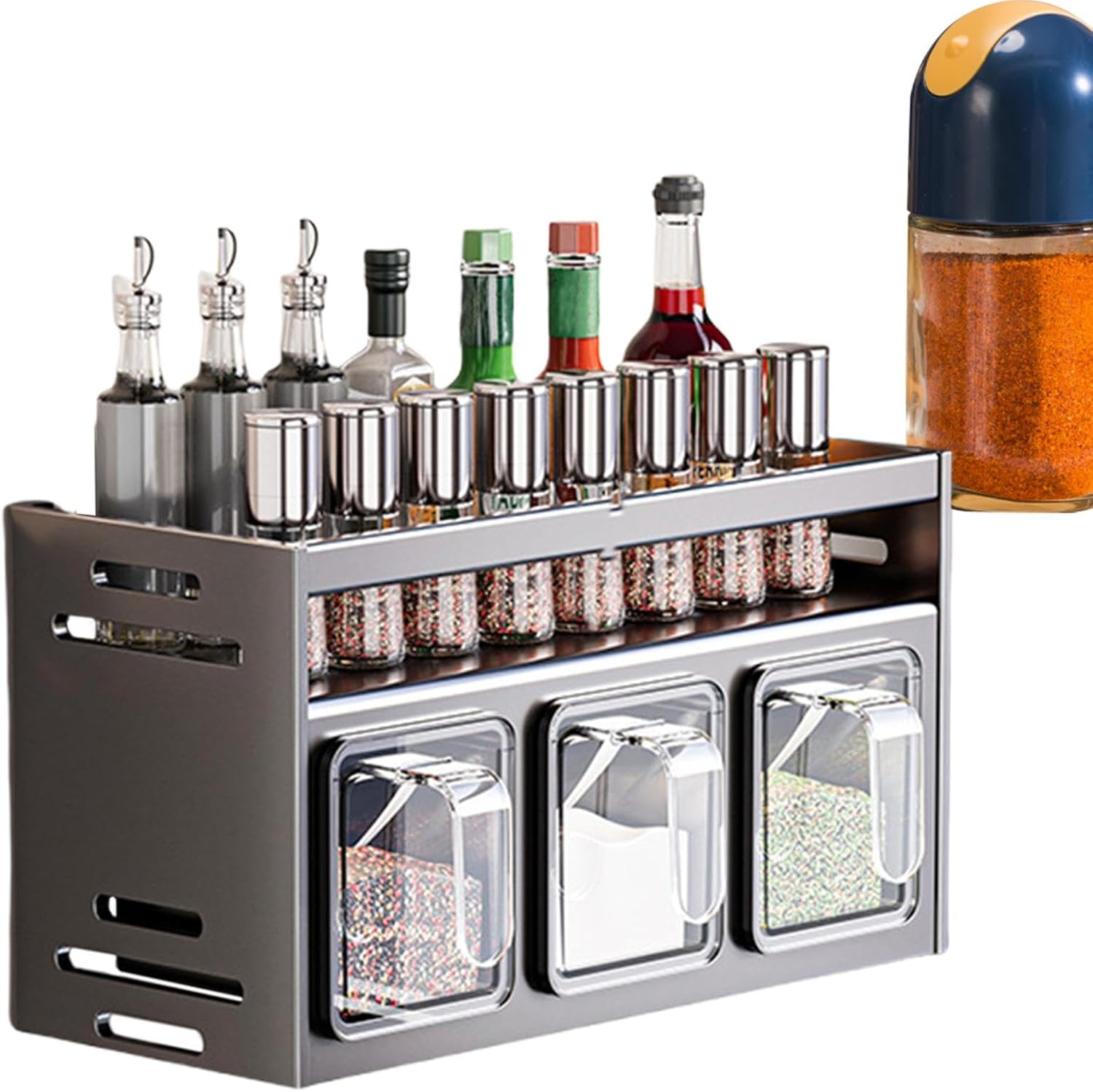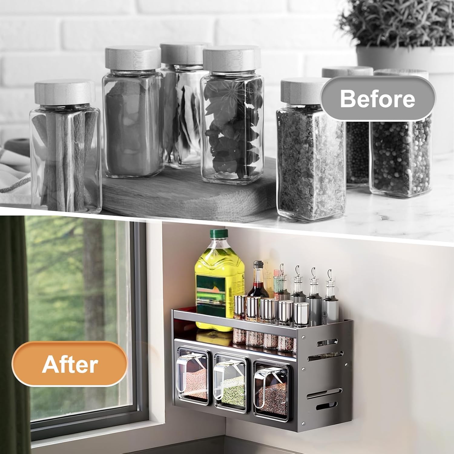 Dizajn z dvojnim slojem omogoča več prostora in popoln pregled nad vsemi stekleničkami in posodicami. Shranjevanje je enostavno, začimbe pa imate vedno pri roki, kar izboljša vašo kulinarično izkušnjo.